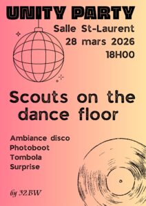 The Unity Party - Scouts on the dance floorPar Unité 32BW / 25 février 2026 The Unity Party - Scouts on the dance floor 18h00 28 mars 2026 iCal Google Lire la suite Voir le calendrier complet